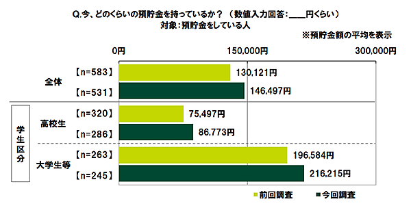 また、預貯金をしている531人に預貯金額を聞くと、高校生で平均86,773円(前回調査75,497円)、大学生等で平均216,215円だった(前回調査196,584円)。預貯金をしている人は減少していたが、預貯金をしている人の預貯金額平均は大きく増加しており、消費意欲の高い層と貯蓄志向の高い層にわかれつつある。