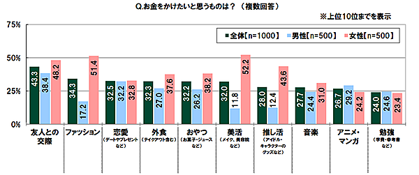 そこで「お金をかけたいと思うもの」を聞くと、「友人との交際」43.3%、「ファッション」34.3%、「恋愛(デートやプレゼントなど)」32.5%が全体では上位となった。男女別では男性1位「友人との交際」38.4%、2位「恋愛(デートやプレゼントなど)」32.2%、3位「アニメ・マンガ」29.2%で、女性1位「美活(メイク、美容院など)」52.2%、2位「ファッション」51.4%、3位「友人との交際」48.2%と、やや異なる傾向を見せた。