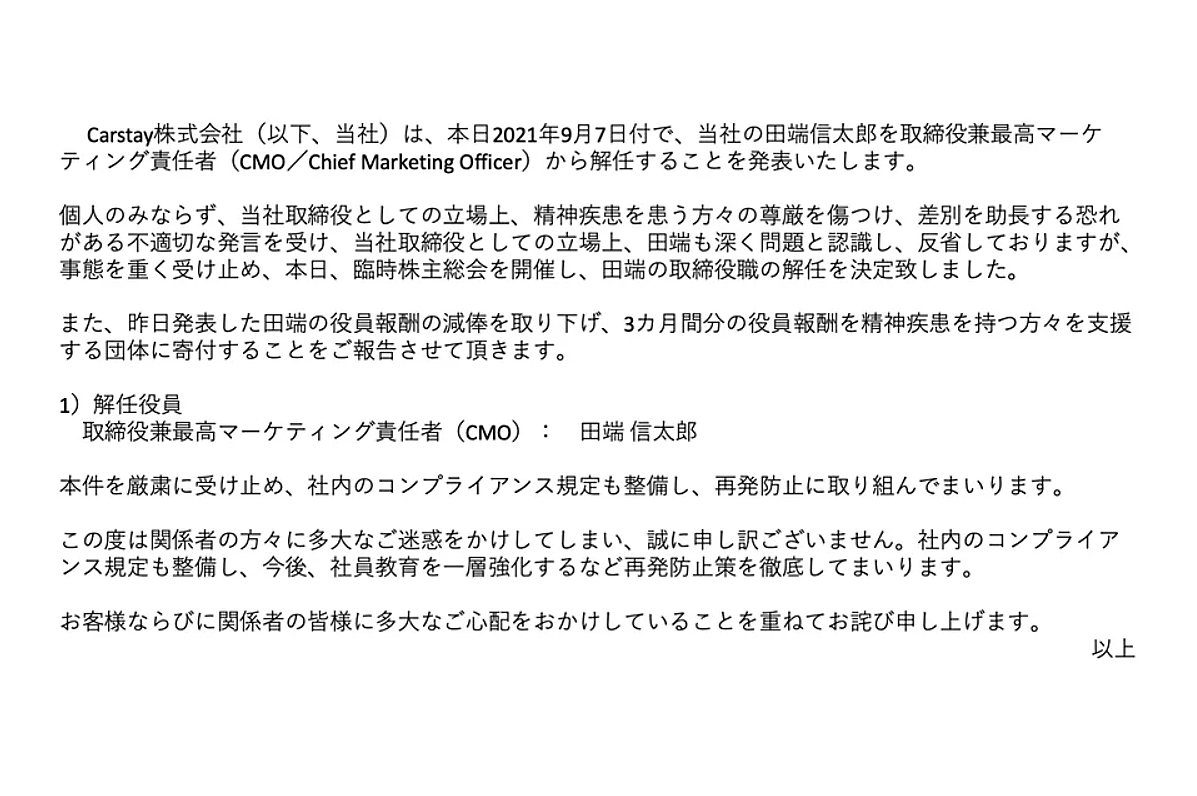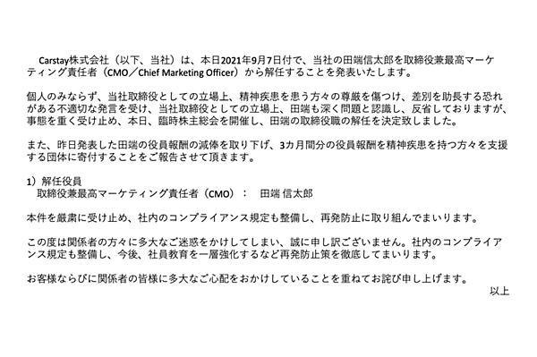 田端氏の投稿は個人の立場での発信で、Carstayの事業運営方針とは関連性がないものの、同社は事態を重く受け止めた。投稿後に田端氏から報酬返上の申し出があり、9~11月の3カ月間、役員報酬を30%減俸する、と9月6日に公表していた。しかし9月7日になって取り下げ、3カ月間分の役員報酬を精神疾患のある人を支援する団体に寄付することにした。