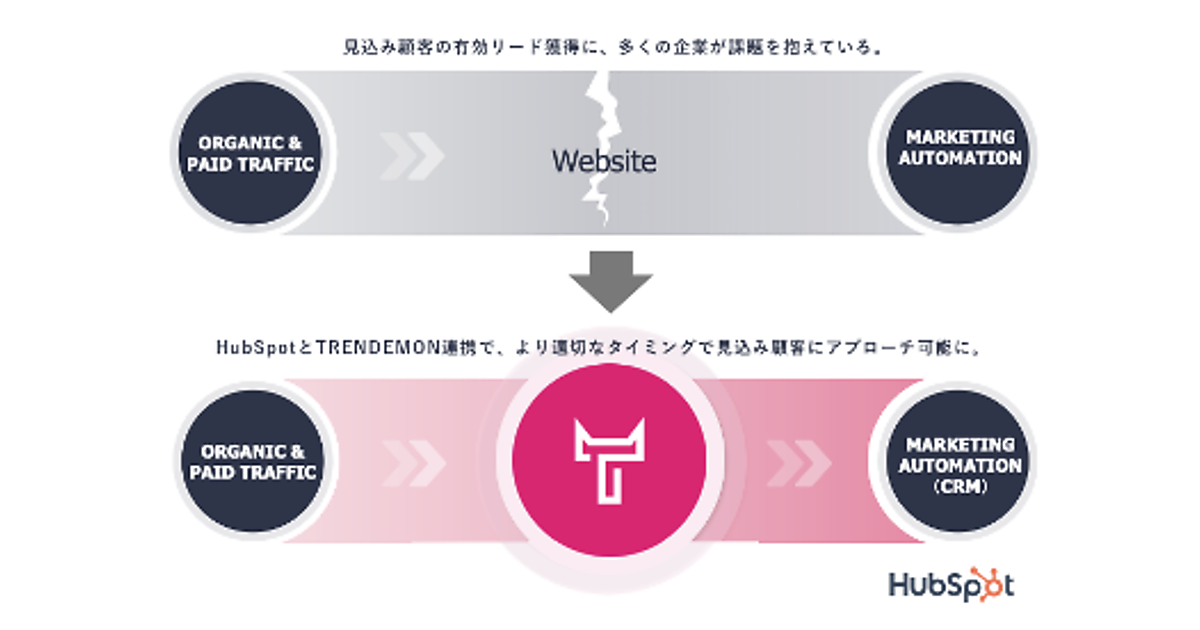 TRENDEMONとHubSpotの連携サービスは日本で初めて。100は、HubSpotの運用実績が多くあり、知見・ノウハウを持つ。HubSpotとTRENDEMONとのAPI連携によってHubSpot利用企業は、アノニマスユーザー(匿名)からリード(見込み客)獲得後のMQL(マーケティング活動で得た見込み客)、SQL(営業活動での見込み客)などHubSpot上の独自セグメントベースで分析、可視化、施策が可能になる。