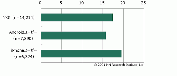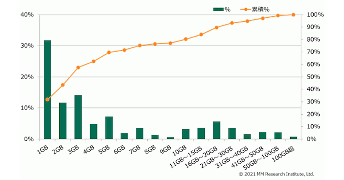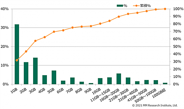また「スマホ利用者のデータ通信量」(2021年6月)は、平均「8.72GB(ギガバイト)」だった。「1GB」31.8%、「2GB」11.7%、「3GB」14.1%など、3GBで収まるユーザーが5割以上、7GBで収まるユーザーが7割以上を占めている。