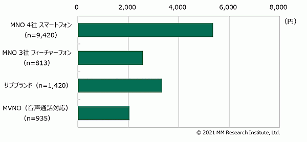 MM総研(MMR)は、「携帯電話の月額利用料金とサービス利用実態」について、最新調査の結果を発表した。MNO4社(NTTドコモ、au、ソフトバンク、楽天モバイル)、サブブランド(ワイモバイル、UQモバイル)、およびMVNO各社の利用者を対象にアンケートを実施した。