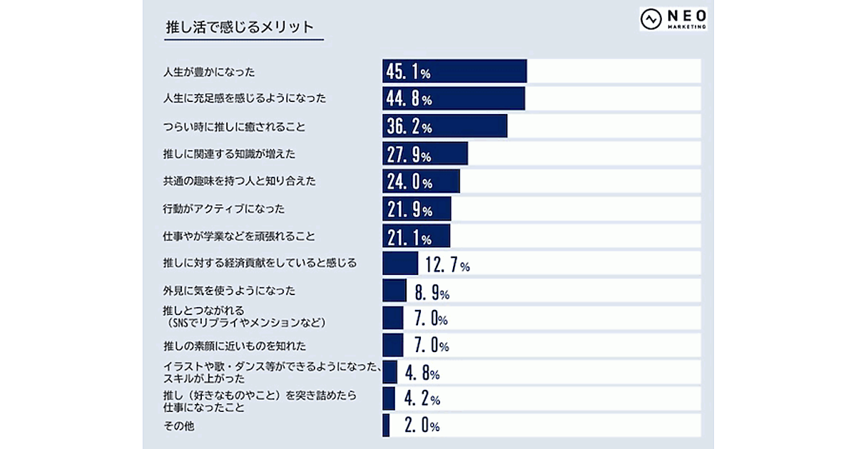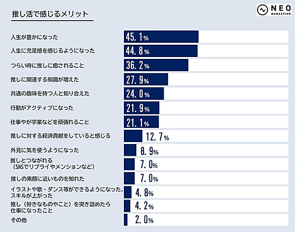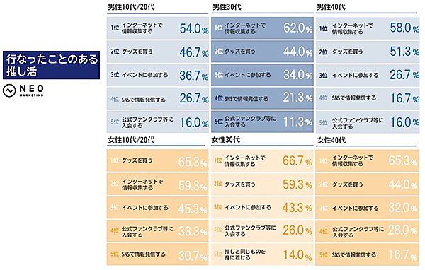 ネオマーケティングは、「推し活」をテーマにしたインターネットリサーチの結果を発表した。立教大学の「eビジネス&マーケティング」(大嶋淳俊 兼任講師)を受講した学生との共同調査となる。全国の13~49歳の男女で推しているものがある900人が回答した。