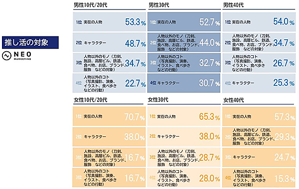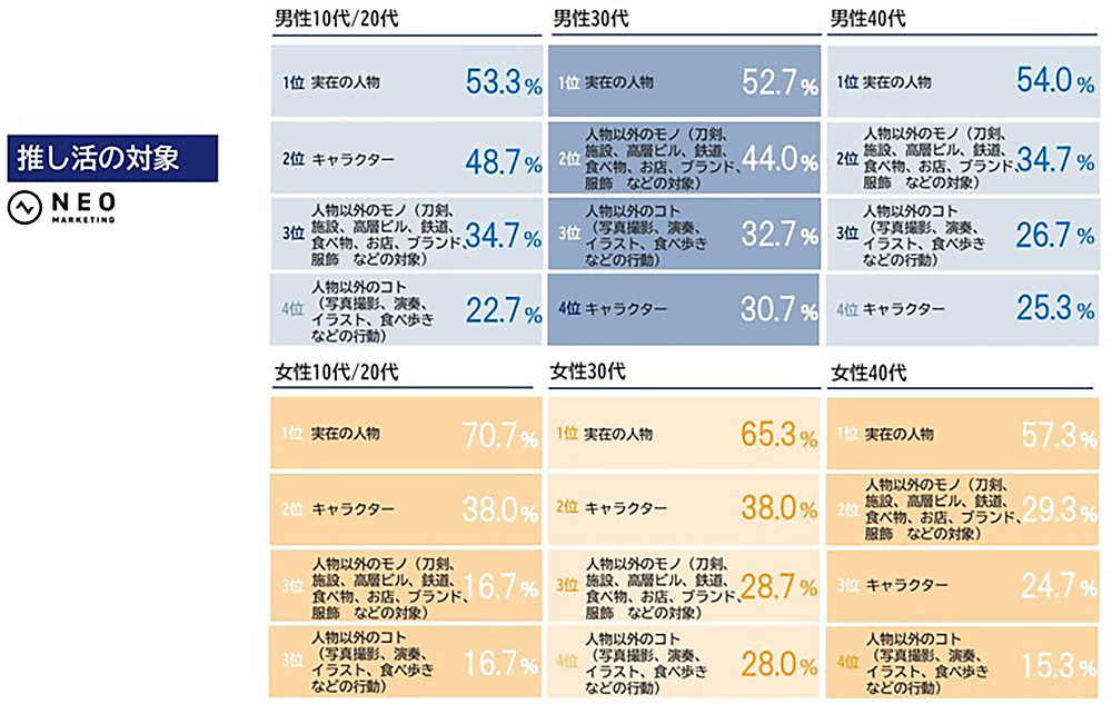 推すのは「実在の人物」だが、男性は「キャラ」や「モノ」も推しがち