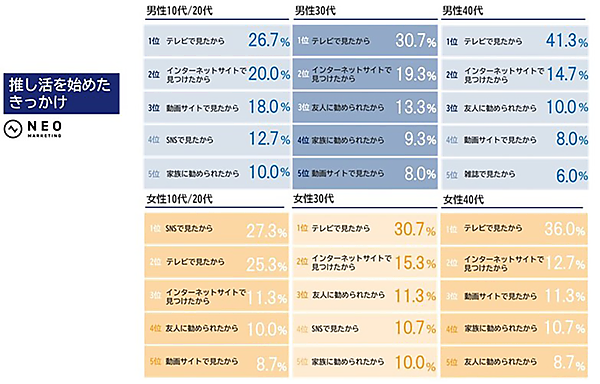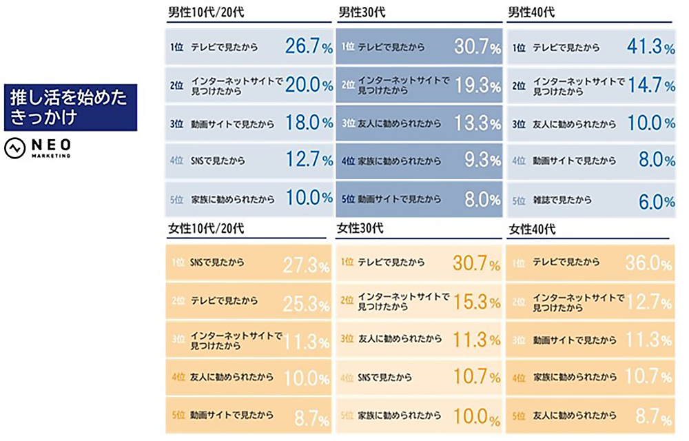 「推し活を始めたきっかけ」では、ほぼ全年代で「テレビで見たから」が最多だが、女性10/20代のみ「SNSで見たから」27.3%が「テレビで見たから」25.3%を上回った。InstagramやTikTokなど、SNSが主要な情報メディアで、彼女らの行動の推進力になっていることがわかる。