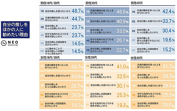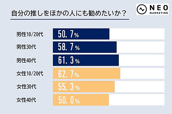 最近注目の“推し活”、女性は年齢が下がるほど、男性は年齢が上がるほど「自分の推しを他にも勧めたい」!【ネオマーケティング調べ】