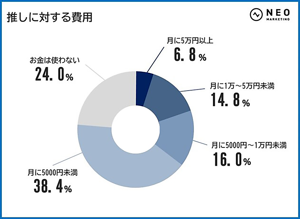 そこで「推しに対して、月に平均どの程度費用を使っているか」を聞くと、「月5000円未満」38.4%が最多層ながら、「お金は使わない」24.0%という人も存在する。一方「月5万円以上」も6.8%存在するなど、推し活の精神的・金銭的な感覚は、人によりかなり異なりそうだ。