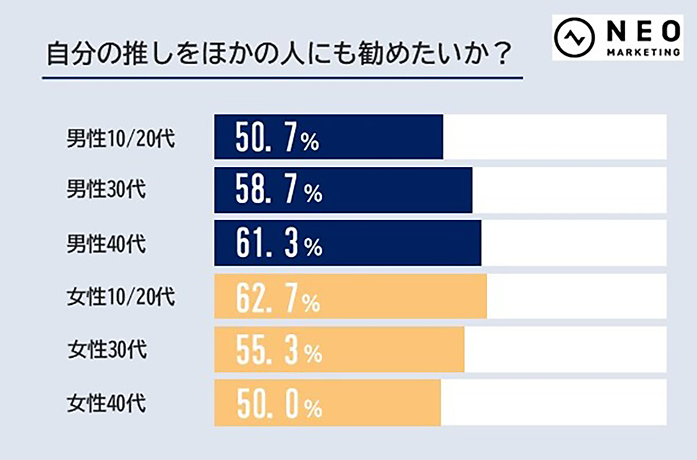 また「自分の推しを他の人にも勧めたいと思うか」を聞くと、男性は年代が上がるにつれ勧めたいと思うが、女性は年代が上がるほど勧めたくないと思うことが明らかとなった。理由については定かではないが、熱意や家族との関係性が影響していると考えられる。