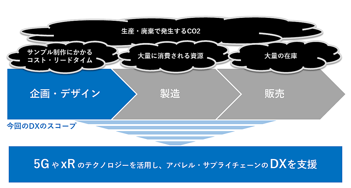アパレル業界は企画、デザインの段階で実物サンプルが多く作られ、時間とコストがかかるうえ布地も大量に廃棄されることから、DX化を後押しする。第1弾として両社は、バーチャルヒューマンに実物と同等の高精細な3D CGの衣服を着せるシステムを開発した。実物サンプルがなくても商品が実寸大で確認でき、時間短縮とコスト削減を実現する。商品イメージをリモートで共有することも可能。