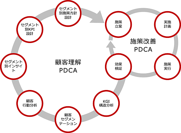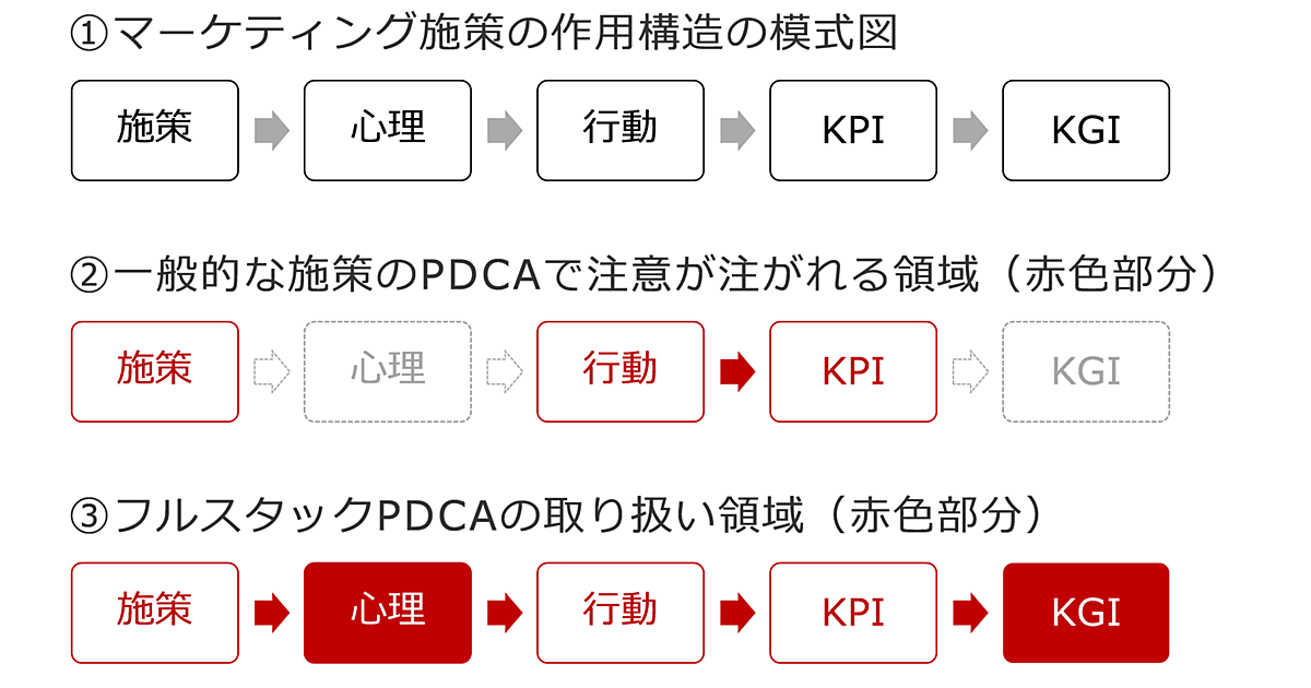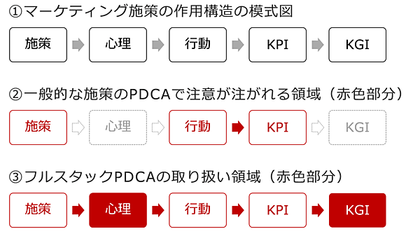 フルスタックマーケティングPDCAは、DXBが提言するPDCA(計画・実行・評価・改善)施策。マーケティングに関わる全要素を考慮し、顧客理解に基づいてKGI達成を目指す。施策のPDCAに顧客理解のPDCAを組み込み、施策のアイディア開発を容易にする。サービスではKGIの構造分析、KPI(重要業績評価指標)設計などをDXBが担当し、インサイト仮説と施策の方針設計をパートナーと行う。