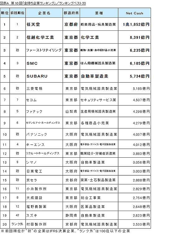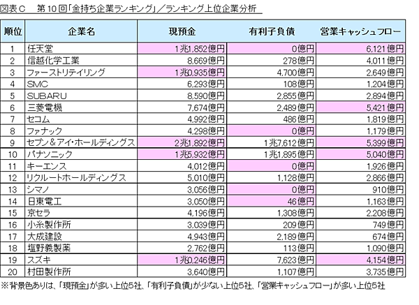 ランキング上位20社について、「セブン&アイ・ホールディングス」や「パナソニック」は多額の負債を上回る現預金を有しており、「任天堂」は有利子負債が少ないことが上位の要因と、分析されている。