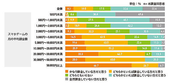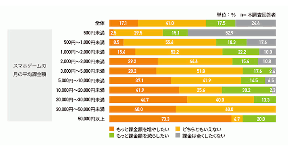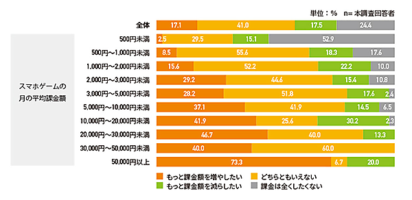 特に課金額別で見ると、月課金額が500円未満の人では、半数以上の52.9%が「課金はまったくしたくない」と回答している。ただし、課金額が上がるほど、「もっと課金額を増やしたい」という人もほぼ比例して増加しており、「5万円以上」では73.3%が「もっと課金額を増やしたい」としている(サンプルサイズが小さいため参考値)。