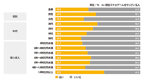 まず「直近1年間でのスマートフォンゲームへの課金経験」を聞くと、全体の39.0%が該当した。女性より男性の方がスマホゲームへ課金する傾向が高い。また年齢が低いほど課金傾向が高かった。
