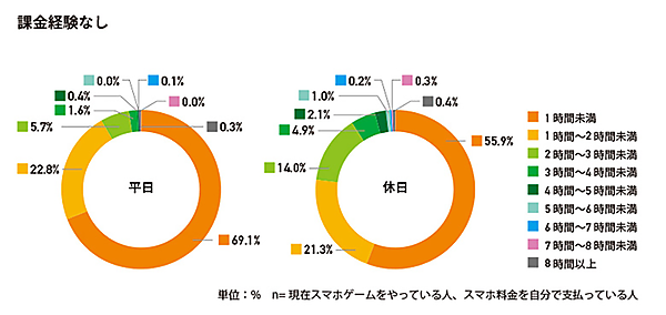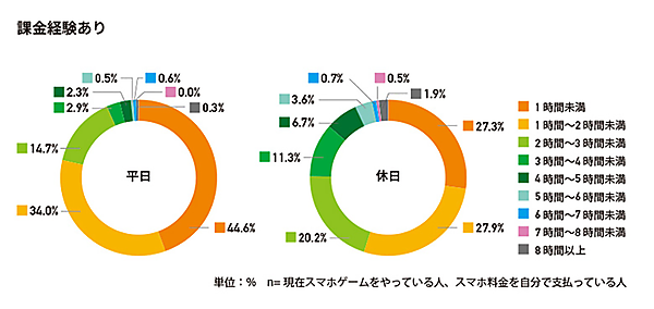 ここからは、課金経験があった800人を対象に、質問を行った。まず「ゲームアプリの平均プレイ時間」は、課金経験がある人は、「平日1時間未満」44.6%、「1時間~2時間」34.0%、「2時間~3時間」14.7%だが、課金経験がない人は、「平日1時間未満」69.1%、「1時間~2時間」22.8%、「2時間~3時間」5.7%と、やはり課金している人ほど長い。また、課金経験がある人は、休日になると「3時間~5時間」の層が増え、プレイ時間が大きく増加している。