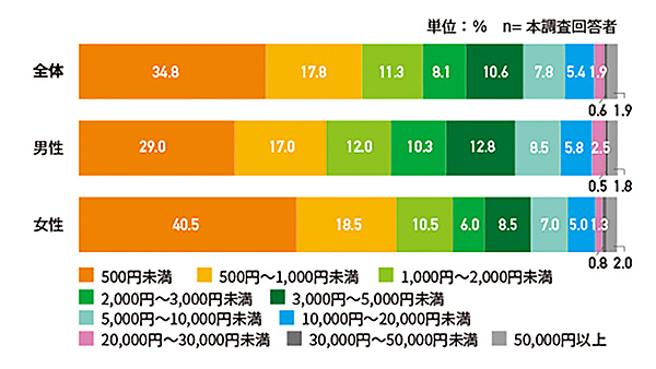 次に「スマホゲームに費やす月の平均課金額」を段階別に選択式で聞くと、全体では「500円未満」34.8%、「500円~1000円」17.8%で半数を占める。一方、「5万円以上」も1.9%存在し、その差は大きい。ゲーム会社の収益としては、500円×100人=5万円×1人だが、多様な戦略が出てくると思われる。