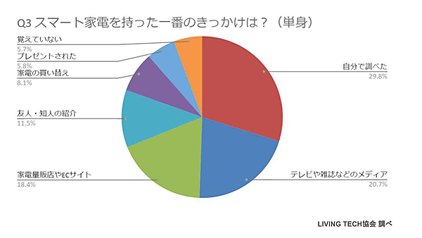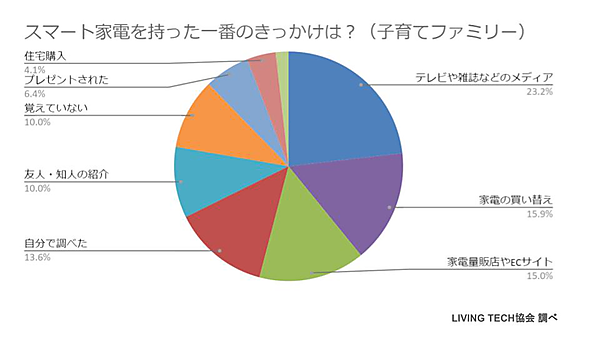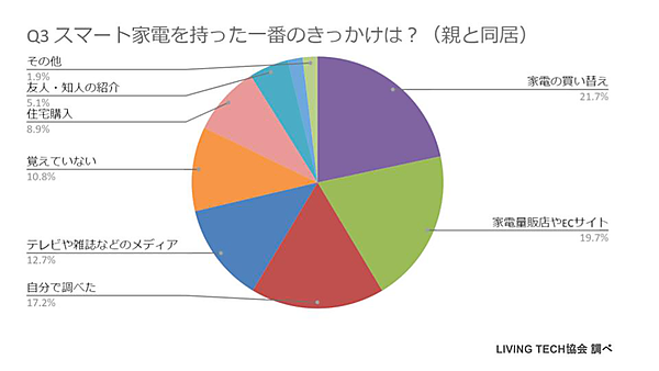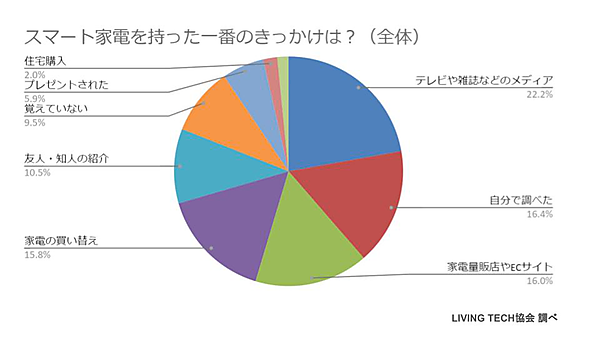 まず「スマート家電を購入や入手をする以前に、同様の設備・製品を体験したか?」という設問には、53.5%が「はい」と回答しており、本格導入の前になんらかの体験をしていることがわかる。また、「スマート家電を持った一番のきっかけ」という質問に対しては、「テレビや雑誌などのメディア」22.2%、「自分で調べた」16.4%、「家電量販店やECサイト」16.0%などの声が上がる。