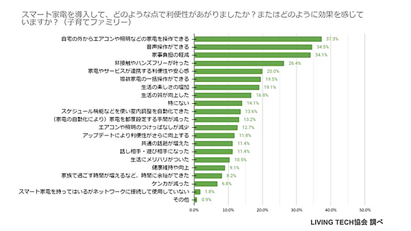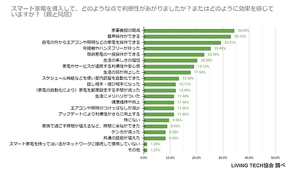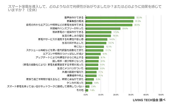 こうしたスマート家電について、その利便性や効果を聞くと、「音声操作ができる」32.3%という意見が最多で、僅差で「家事負担の軽減」31.5%、「自宅の外からエアコンや照明などの家電を操作できる」30.9%が続く。