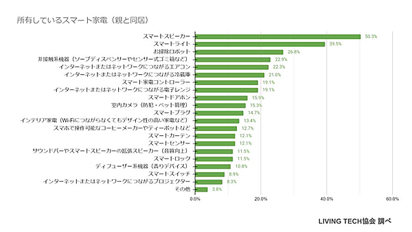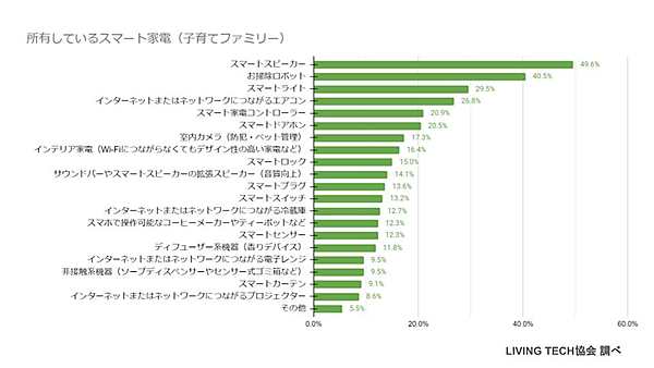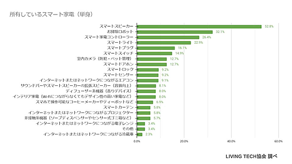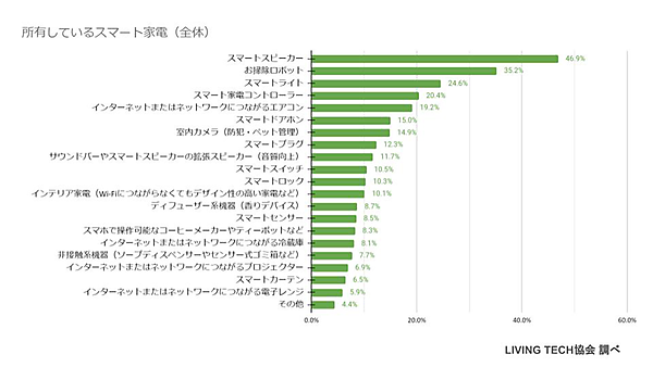次に、具体的に所有しているスマート家電を聞くと、一番多いのは「スマートスピーカー」46.9%で、「お掃除ロボット」35.2%、「スマートライト」24.6%がそれに続いた。