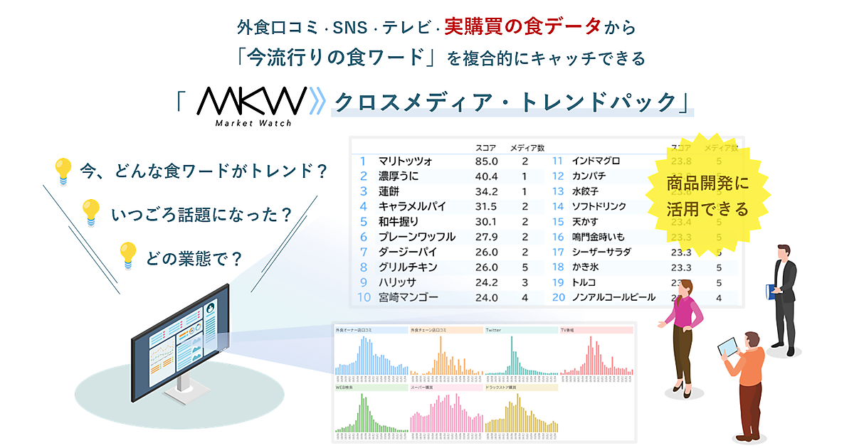 MKWクロスメディア・トレンド パックは、食の商品開発に特化した複合データ分析ツール。年間50億件超の購買データと、7000万人超の生活者のライフスタイルデータを融合したデータベースに、CCCマーケティングの食に関する単語のマスターデータ「しょくたん」を介して外食口コミデータ▽SNSデータ▽テレビデータを連携して「今はやりの食関連ワード」を分析。食にまつわる多種多様なデータからトレンドの伝播を可視化する。