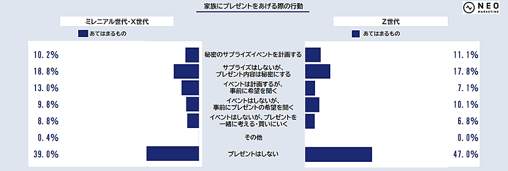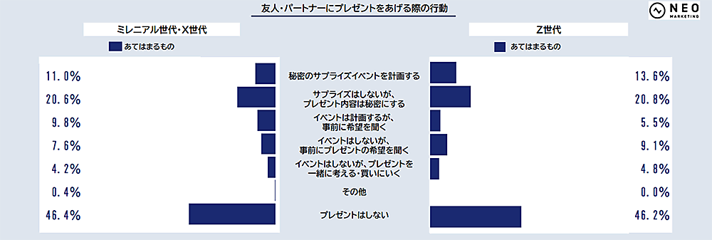 「プレゼントをあげる際の行動」では、「イベントを計画し、プレゼントは事前に希望を聞く」はミレニアル世代・X世代がZ世代より高いが、「イベントは計画しないが、プレゼントは事前に希望を聞く」はZ世代のほうが高い。この結果に対し、ネオマーケティングでは、「Z世代は“失敗を避ける・保守的”傾向があるのではないか」と指摘している。