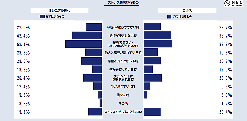 そこで視点を変えて「ふだんストレスを感じること」という質問を投げかけると、「納得できない・つじつまが合わない時」46.4%が全体で最多となった。しかしミレニアル世代とZ世代を比較すると、Z世代は39.9%にとどまるなど、他世代より数値が低かった。「ストレスを感じることはない」という回答も23.4%あり、ミレニアル世代の19.2%より高かった。