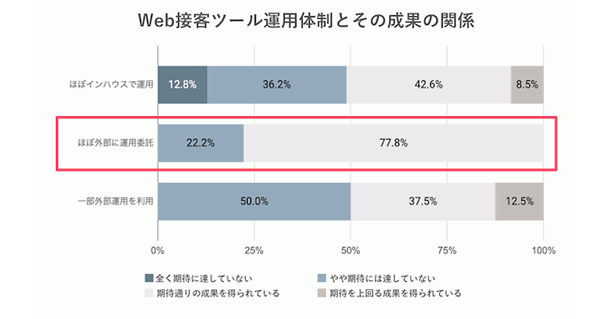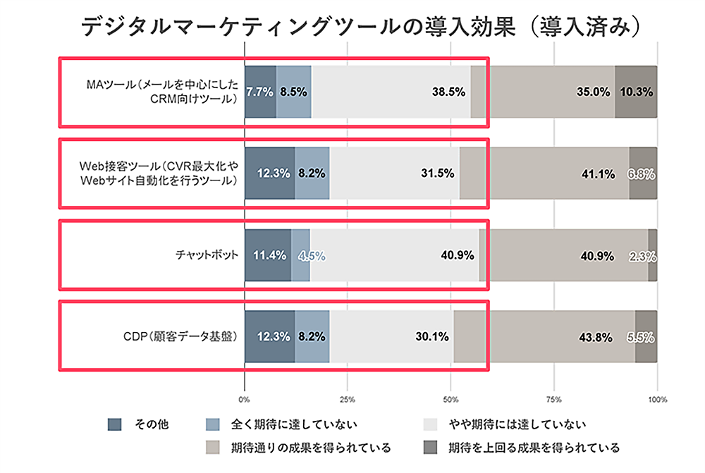 ノウハウ・人材不足の解決策として「MAツール」「Web接客ツール」「チャットボット」「CDP(顧客データ基盤)」といったツール群の導入効果について聞くと、「全く期待に達していない」「やや期待には達していない」「その他」の合計は、すべてのツールで半数を超えている。ツール導入は決定打たり得ず、人材育成が重要なことがわかる。