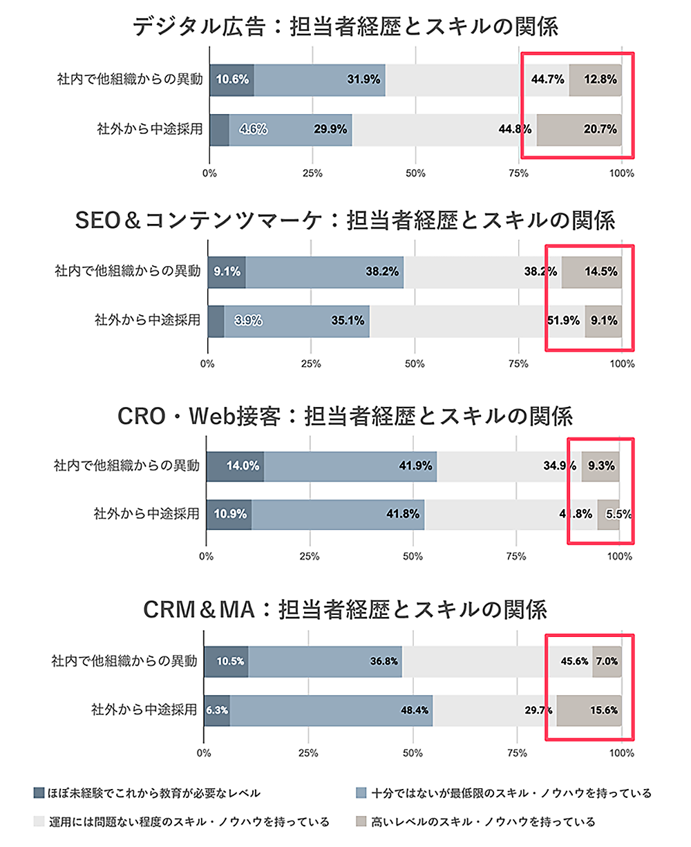 さらに、ノウハウ・人材不足を補う手段として「プロ人材の中途採用」が考えられるが、「プロ人材の中途採用」と「社内の他組織からの移動」について比較した結果、スキルについて圧倒的な差はなく、「CRO」「SEO&コンテンツマーケ」においては、社内人材のほうが「高いレベルのスキル・ノウハウを持っている」と評価されていた。