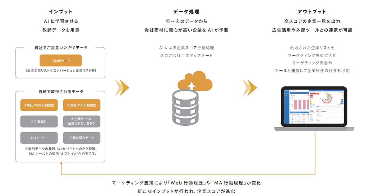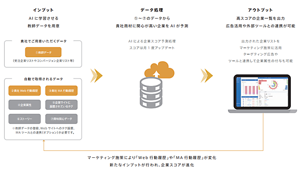 自社の過去の受注企業一覧データと、820万拠点のデータを保有するLBCを組み合わせ、AIが見込み度スコアを算出。データに基づく見込みリストの出力で優先順位が明確になり、新規開拓を含め現場での行動につなげられる。スコアは受注企業一覧データのほか、自社サイトの行動履歴も利用。ウェブ広告と連携してターゲティング広告に生かすことでマーケティング施策も広げられる。