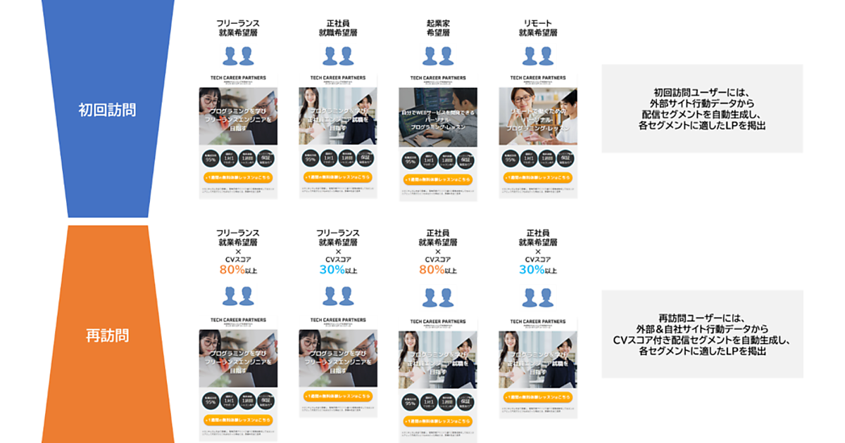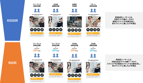 SaiLとMicroscopeの連携で再訪ユーザーだけでなく初回来訪も含めた全ユーザーを複数のセグメントに自動分類し、セグメントごとにLPを出し分けるようになった。芸能関連業界で実証実験したところ、通常のLP配信時のCVRと比べて全オーディエンスで平均的に効果が高いLPを配信した場合の改善率が25.8%だったが、SaiL×Microscopeを活用してセグメント別に効果が高いLPを配信した場合は改善率38.7%を達成したという。
