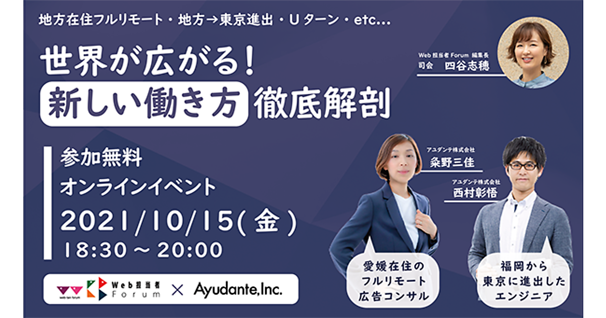 アユダンテは、地方在住フルリモート・東京進出・Uターンなど、働き方に関する様々な質問に対談形式で答えるイベント「世界が広がる!新しい働き方 徹底解剖」を10月15日(金)にオンラインにて開催する。