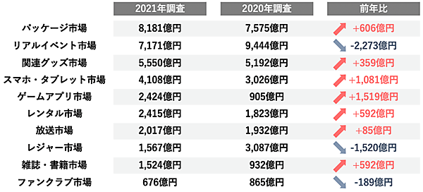 各市場の推計規模では、「リアルイベント市場」が9,444億円→7,171億円と落ち込んだほか、「レジャー市場」も低迷。接触系イベントが制限された「ファンクラブ市場」も減少となった。一方で「スマホ・タブレット市場」「ゲームアプリ市場」は1,000億円以上の増加を見せ、「パッケージ市場(CDや本、DVD等)」「関連グッズ市場」も好調だ。