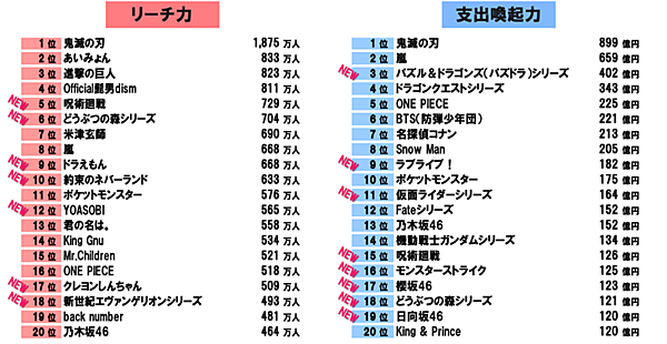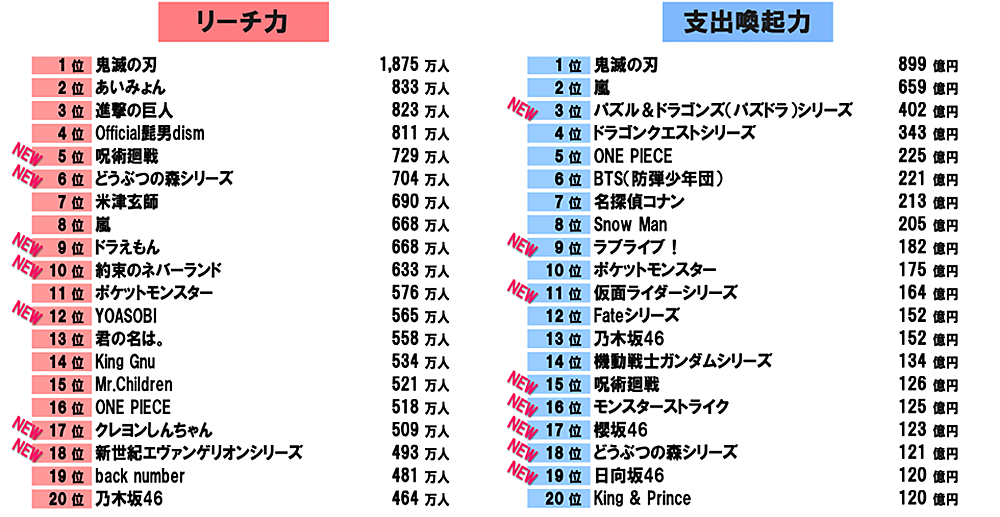 具体的なコンテンツごとに、リーチ力・支出喚起力ランキングを見ると、リーチ力・支出喚起力のいずれも「鬼滅の刃」が1位。リーチ力では「呪術廻戦」「どうぶつの森シリーズ」「ドラえもん」「約束のネバーランド」が新たにトップ10に入った。支出喚起力では「パズル&ドラゴンズ」「ラブライブ!」の2ゲームが、今期は新たにトップ10入りした。なおここでいう新規は、2020年調査で20位以内でなかったのに、2021年調査で20位以内にランクインしたコンテンツを指している。