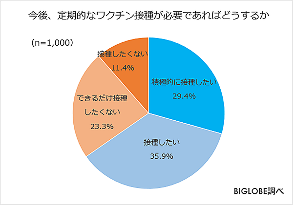 あらためて全体の1,000人に「今後、新型コロナウイルス感染防止のため、定期的にワクチンを接種する必要がある場合、どうするか」と聞くと、「積極的に接種したい」29.4%、「接種する」35.9%で6割を超えたが、「できるだけ接種したくない」23.3%、「接種したくない」11.4%と、ワクチン接種に否定的な層も一定数存在した。