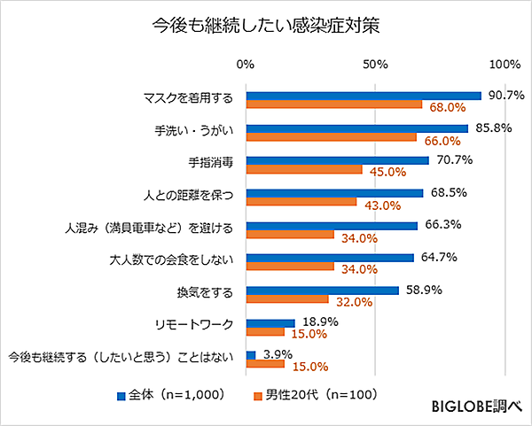ワクチン以外の感染症対策について「今後も継続する(したいと思う)こと」を聞くと「マスクを着用する」90.7%。「手洗い・うがい」85.8%、「手指の消毒」70.7%が上位となった。いわゆる“三密”も回避するという人が多い。ただし性年代別で男性20代においては、すべての対策が全体平均と比較して大幅に下回っており、「今後も継続することはない」のみ平均を上回った。