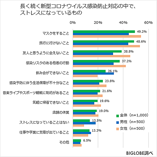 一方で「新型コロナ対策のなかで、ストレスになっているもの」では、「マスクをすること」49.2%が最多で、継続する感染対策であるとともに、最もストレスを感じていることが判明した。