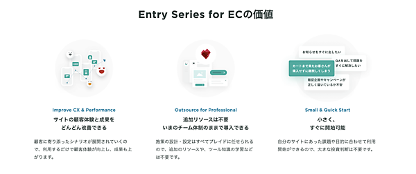 KARTE Entry Seriesは、ECサイトの改善で最初の成功体験につながる成果が素早く得られるように開発した。専門的な知識やツールのスキルがなくとも始められ、ECサイトに特化したシナリオから自社サイトの課題に合わせて自由に選べる。導入時の設定や実装、レポートまでアウトソースすることができる。