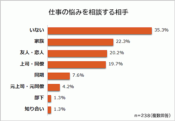 さらに「仕事の悩みを相談する相手」を聞くと、「いない」35.3%が最多で、「家族」22.3%、「友人・恋人」20.2%など、身近な知人があがっている。上司・同僚、同期といった、仕事について相互理解が深いはずの知人には相談できない・していない人のほうが多数派だ。「会社の人間関係の相談は家族、仕事そのものの相談は社内の違う部署の先輩」と、悩みごとによって相談相手を変えている人もいた。
