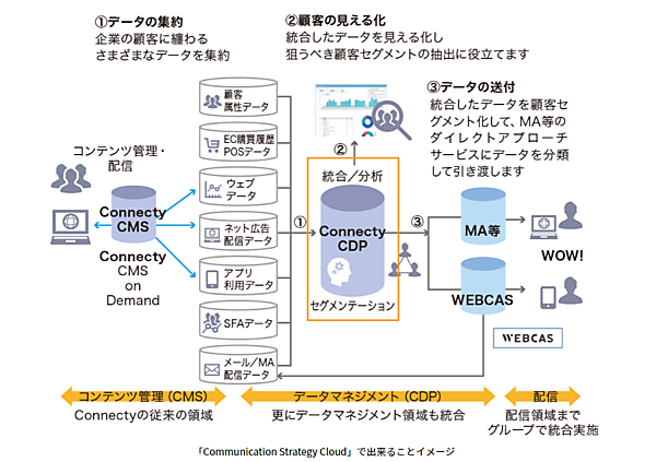 統合データから顧客をセグメント化してMA(マーケティング自動化)ツールに渡す。2020年9月に資本連携したWOW WORLDのコミュニケーションシステム「WEBCAS」と連携してメールやLINEでアンケートを配信するなど顧客属性に合わせた情報配信ができる。今後は、コンテンツ管理のCMSとデータマネジメントのCDPの両方を兼ね備えた国産クラウドサービス「Connecty Communication Strategy Cloud」として展開していく。