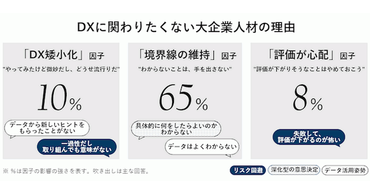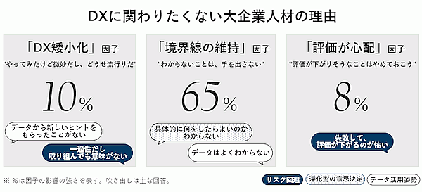 同社の分析によると、「DXに関わりたくない理由」としては、“具体的に何をしたらいいか分からないので手を出したくない”という「仕事の境界線の維持」という考えの影響が、約65%特に大きかった。“どうせ流行りに過ぎない”という「DX矮小化」は10%、“評価が下がりそうだから関わりたくない”という「評価が心配」は8%に留まっている。