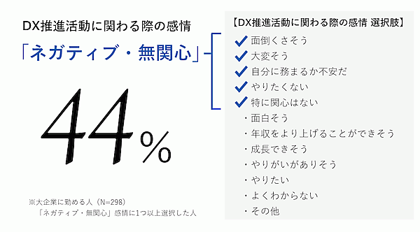 まず「勤め先でDXやデジタルビジネスの推進活動に関わる際に感じること」を選択式で聞くと、「面倒くさそう」「大変そう」「自分に務まるか不安」「やりたくない」「特に関心はない」といったネガティブな感情の選択肢を選んだ人は、44%(n=131)と半数近くを占めている。
