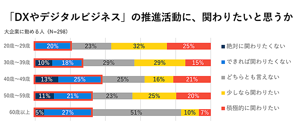 「勤め先でDXやデジタルビジネスの推進活動に関わりたいか」という質問でも、「できれば関わりたくない」と「絶対に関わりたくない」との回答が30%(n=89)と一定数存在する。年代別に見ると、中間管理職が多いであろう40代がとくに多く、38%に達していた。