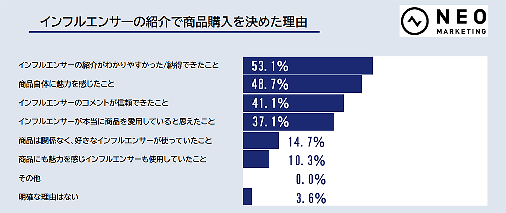 なおインフルエンサーの紹介により商品を購入したことがある人に、「商品購入を決めた理由」を聞くと、「インフルエンサーの紹介がわかりやすかった/納得できたこと」53.1%が最多で、「商品自体に魅力を感じたこと」48.7%を上回っている。