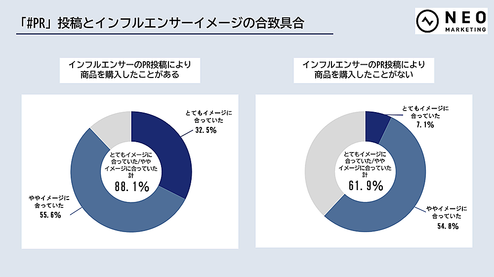 しかしこれを、「インフルエンサーのPR投稿により商品を購入したことがあるか否か」で区分すると、購入者だと「とてもイメージに合っていた」「ややイメージに合っていた」の合計は88.1%だったが、非購入者だと61.9%まで大きく低下した。逆説的に、商品とインフルエンサーのイメージ一致は、購入率に大きく影響すると考えられる。