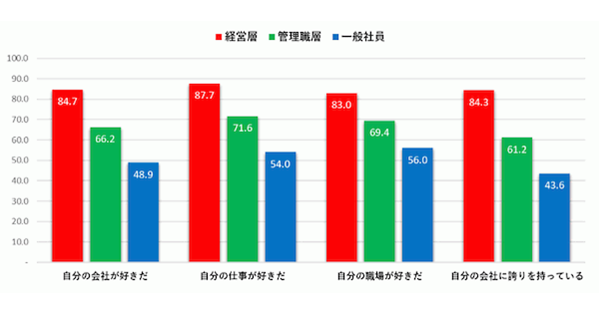 まず「自分の会社が好き」「自分の仕事が好き」「自分の職場が好き」「自分の会社に誇りを持っている」という4項目について質問すると、「はい」という回答は経営層>管理職層>一般社員の順に多かった。「自分の会社が好き」という回答は経営層だと84.7%だが一般社員は48.9%、「自分の会社に誇りを持っている」という回答は経営層だと84.3%だが一般社員は43.6%と、倍近いギャップがあることが明らかとなった。
