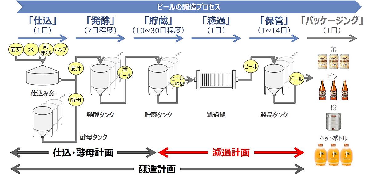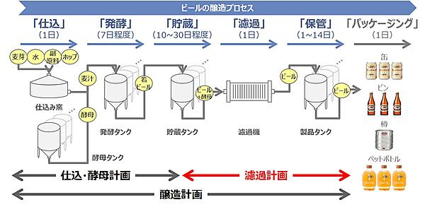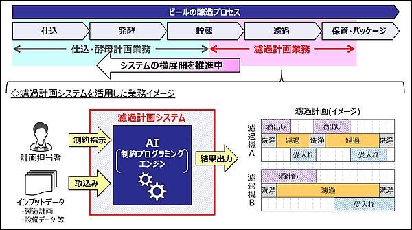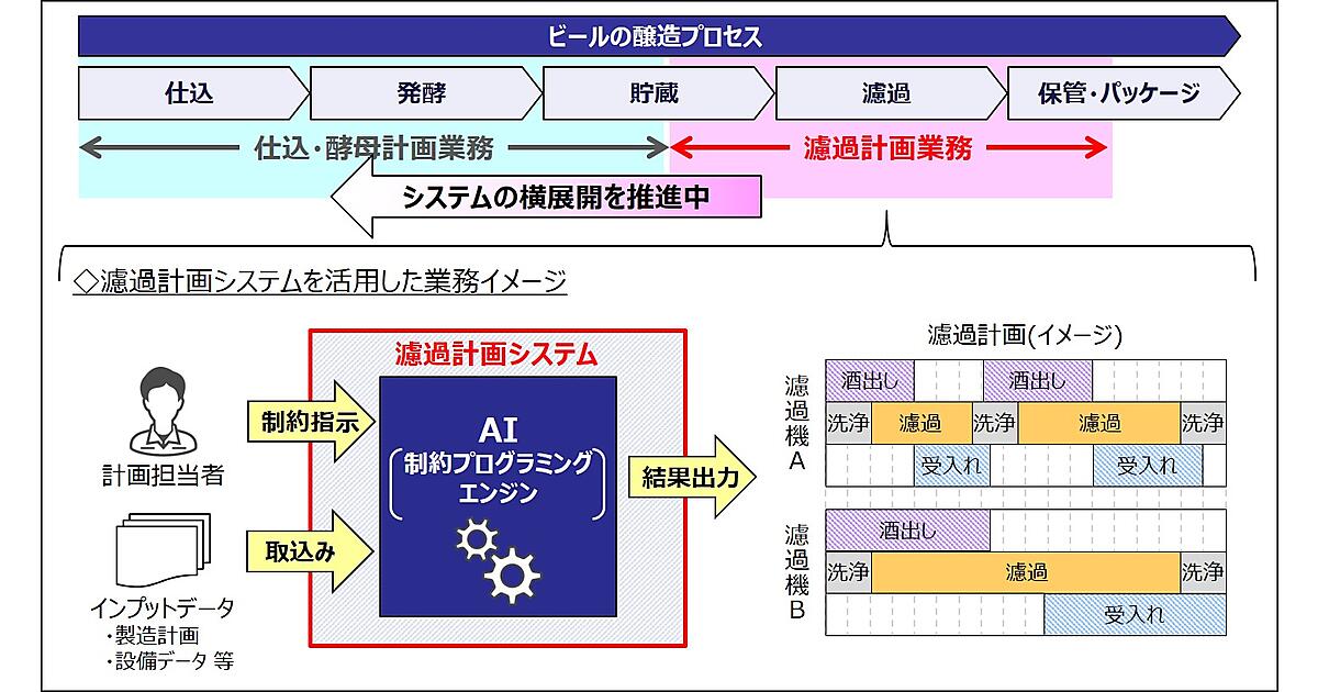 投資総額は約1億6000万円。ビール醸造は、仕込、発酵、貯蔵。ろ過、保管の5つのプロセスで、発泡酒や新ジャンルもほぼ同様の工程。今回のAI化は、商品のパッケージングや出荷を見越して貯蔵やろ過、保管の工程でどの液種をどのタンクに移していくかの計画業務を対象にした。各工場の熟練者にヒアリングし、設備や製造体制が違う制約条件を満たす答えを効率よく見つける「制約プログラミング技術」で業務を標準化した。