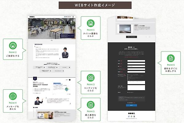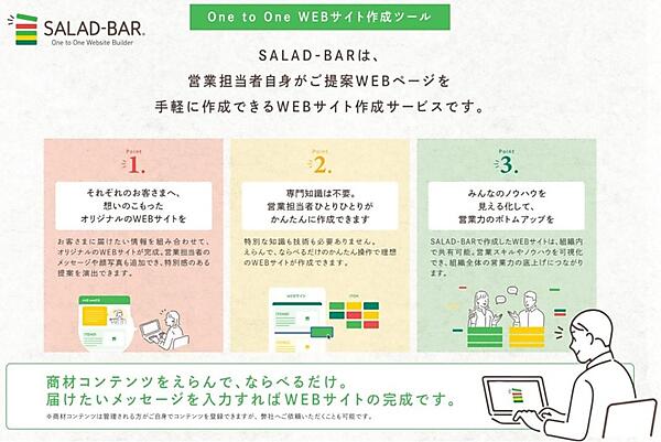 セールス用Webページは、企業ごとに提案したい商材やメッセージを変えられ、営業担当者のメッセージや顔写真も追加して特別感のある提案を演出できる。素材を選んで並べるだけの直感的な操作でWebサイトを構築可能で、特別な知識や技術、専用機材も必要ない。SALAD-BARで作成されたWebサイトを組織内で共有し、営業スキルやノウハウを可視化して組織全体の営業力向上につなげる。