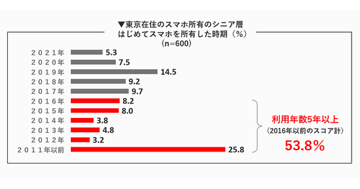 続いて、スマホ所有者である600名を対象に「はじめてスマホを所有した時期」を聞くと、「2011年以前」25.8%が圧倒的に多く、「2016年以前」を集計すると53.8%と半数以上に達している。実はかなり以前からスマホを利用しているシニア層が多い。ちなみに2011年は「iPhone 4S」が発売された年に当たる。iPhone 4Sはソフトバンクに続きKDDIが取り扱いを始めたこと、発表直後にスティーブ・ジョブズが亡くなったことでも注目された機種だ。