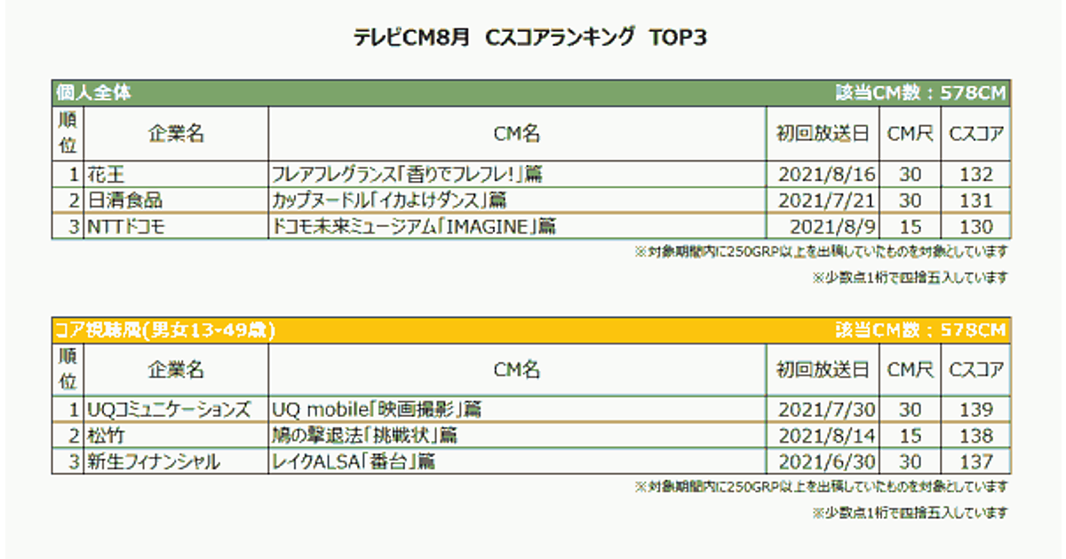 2021年8月1日~31日は、オリンピック開催によって全体のテレビ視聴時間が上昇し、Cスコアの数値も全体的に上昇していた。その結果、テレビCMでは、石原さとみ・永野芽郁が出演する花王「フレアフレグランス 香りでフレフレ!」篇が、個人全体で1位となった(敬称略)。「応援」をテーマとしており、オリンピック期間にもマッチしていたことで好感が広がったと推測されている。以下、日清食品「カップヌードル イカよけダンス」篇、NTTドコモ「ドコモ未来ミュージアム IMAGINE」篇が続く。