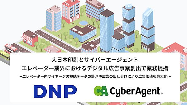大日本印刷(DNP)とインターネット広告事業のサイバーエージェントは、エレベーター業界でのデジタル広告事業の創出で業務提携した、と10月13日に発表した。提携第1弾として、DNPのデジタルサイネージ(電子看板)配信管理システム「SmartSignage(スマートサイネージ)」とサイバーエージェントの広告配信システムを連動して、DNPと東芝エレベータが展開するエレベーター内サイネージで10月から広告の提供を始める。