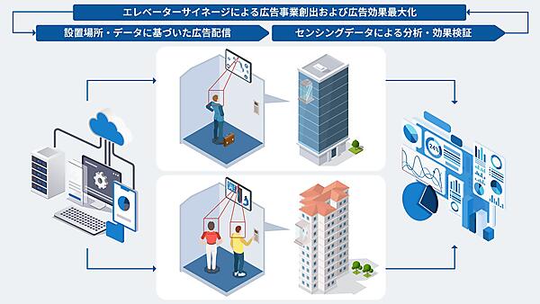 広告主がターゲットにした生活者に対する表示回数(インプレッション)を重視した広告配信をして、広告を届けたいターゲットが利用するエレベーターに最適な広告を配信する。サイネージはセンサー付きカメラを備え、個人を特定せずに広告を見ている人の属性や状況を把握するセンシング機能があるので、これらのデータの蓄積や分析を広告の効果測定や広告主へのフィードバックに生かし、より高い広告効果を実現する。